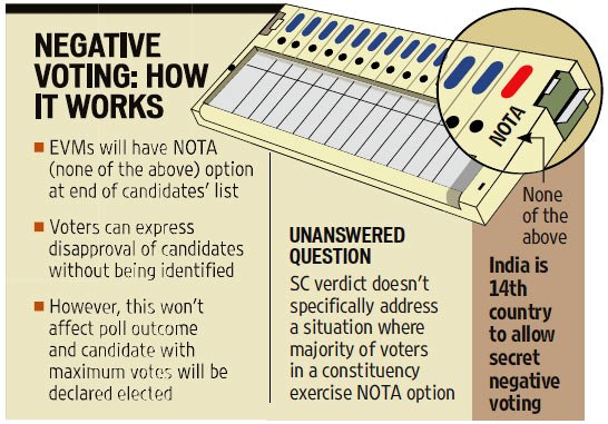 First is adding the option of None of the Above (NOTA) to the list of candidates in an election, so voters can exercise a negative vote – and send a powerful message to political parties and personalities about the quality of politicians society prefers.