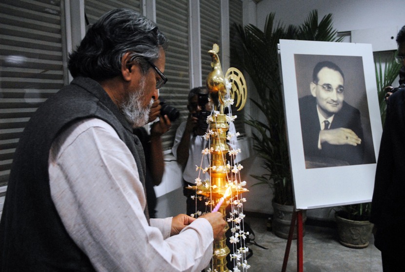 Prof Anil K Gupta lights oil lamp in front of Ray Wijewardene photo before delivering Inaugural Ray Lecture in Colombo, 13 Dec 2011 - photo by Ruveen Mandawala